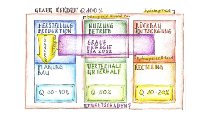 Bei der Energiebilanzierung von Neubau wird heute die Systemgrenze um das Gebäude gezogen. Um den effektiven Energieaufwand eines Bauwerks zu betrachten, sollte die Primärenergie bei Rohstoffgewinnung, den Energieaufwand bei der Herstellung und Betrieb des Bauvorhabens, bis hin zum Abbruch und Entsorgung der Materialen berücksichtigt werden. Oft sind neu erstellte Gebäude im Betrieb sehr energieeffizient, jedoch bei der Produktion der Materialien weisen sie im Gegenzug einen riesigen Energieverbrauch auf. Auch die Lebensdauer spielt bei dieser Betrachtung eine wesentliche Rolle. Der Abbruch ist immer mit sehr viel Energie verbunden.